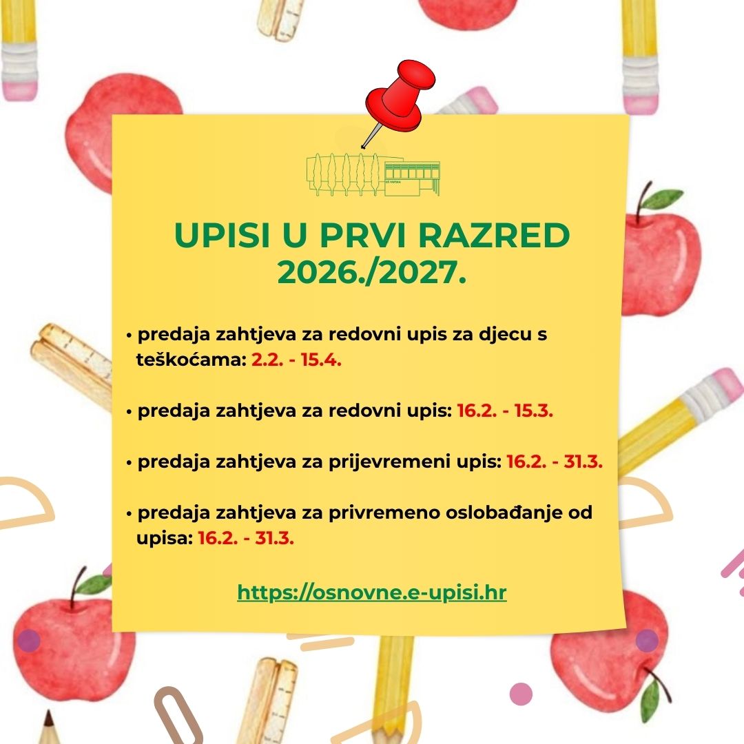 - veljače 2025. godine u Nacionalnom informacijskom sustavu za upise u osnovne škole otvaraju se prijave za redovan upis u 1. razred osnovne škole. Roditelji će preko poveznice https://osnovne.e-upisi.hr/moći podnijeti prijavu za upis svoga djeteta u 1. razred osnovne škole, sve do 15. ožujka 2025. godine.