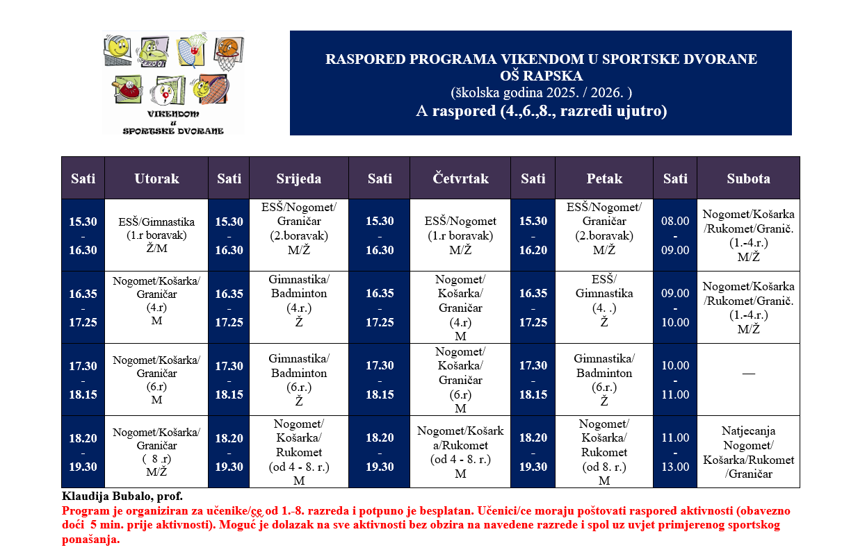 Raspored sportskih aktivnosti u školskoj dvorani 2025./2026.